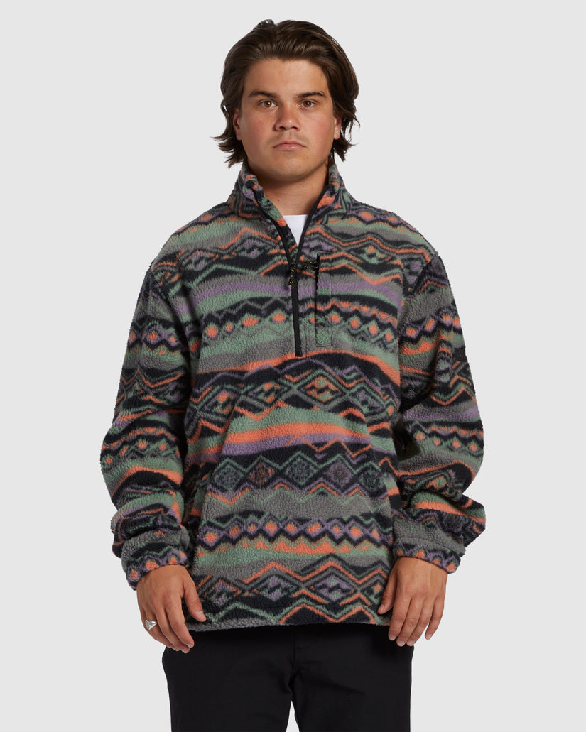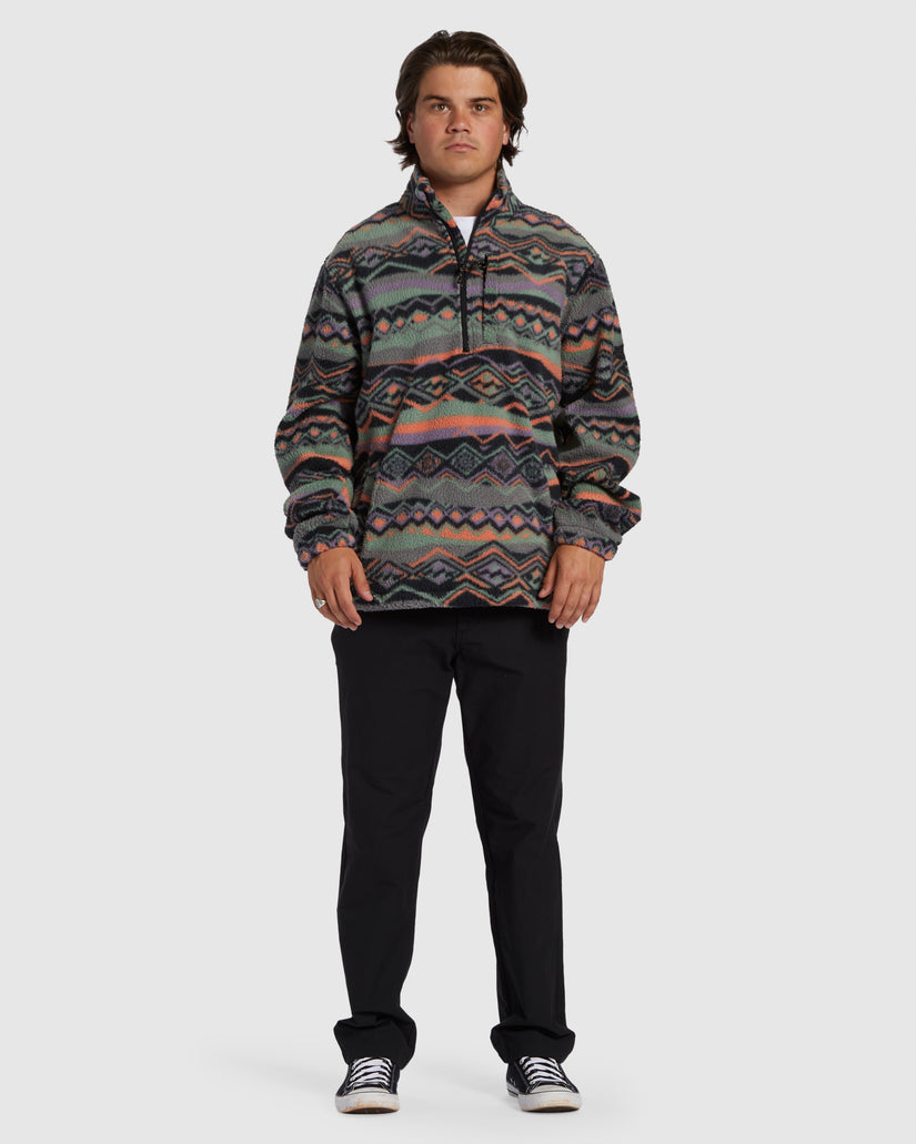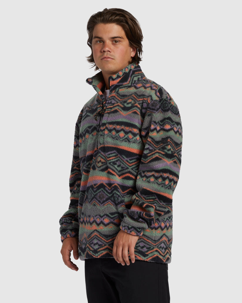 Take your adventure to new frontiers with Billabong's Adventure Division Boundary Half-Zip Mock Neck Fleece. Made of plush Polar Fleece that's crafted with partially recycled fibers, this comfy pullover blends function and style with its chest zip pocket, bungee waistband, and bold print design.