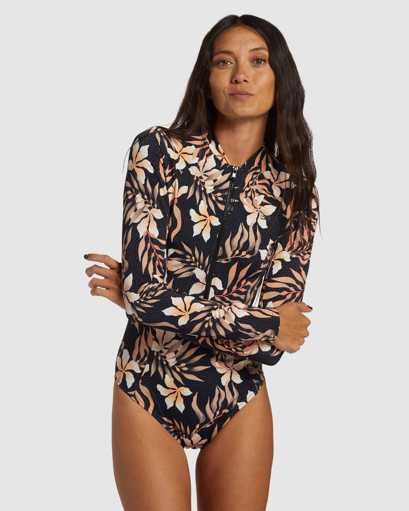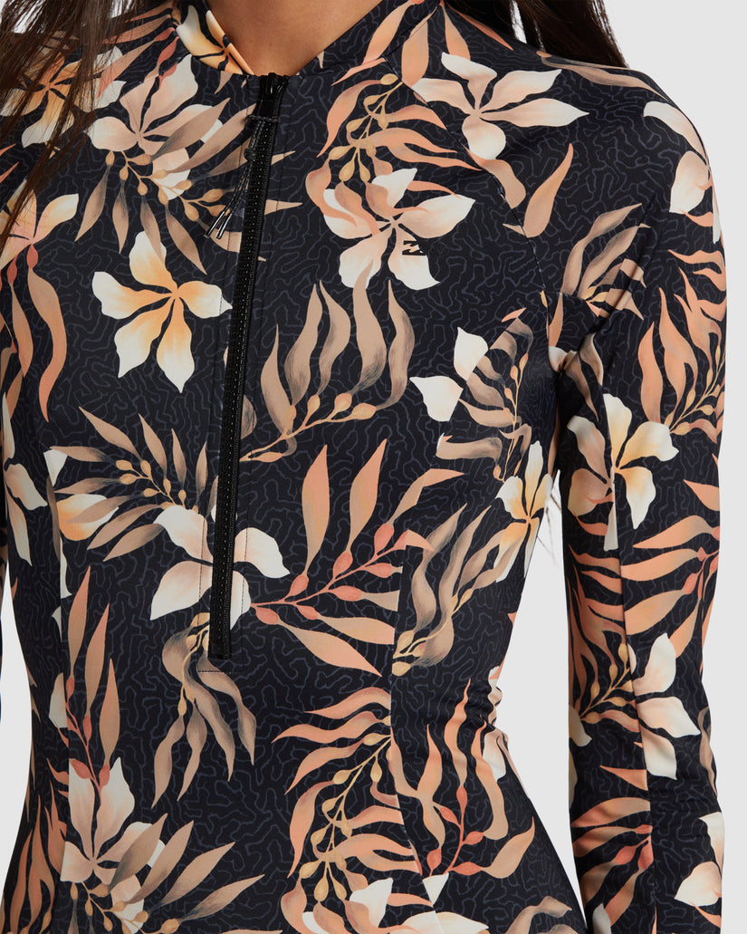 Featuring an all-over floral print, this long-sleeve swimsuit from the Billabong X Coral Gardener Collection blends style and performance with a convenient half-chest zipper, innovative recycled fabric, high sun protection, and a luxe feel.