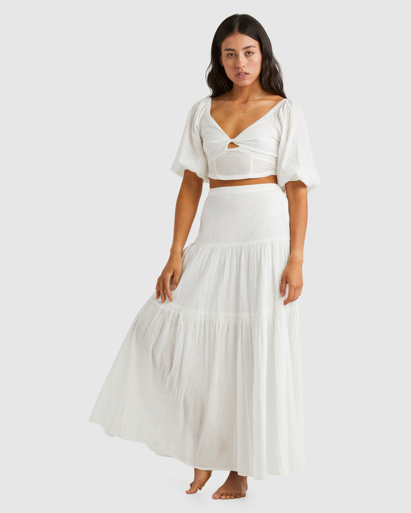 Nothing but sunny skies ahead in the Del Sole maxi skirt. Made with cotton seersucker, this high-rise women's skirt is fitted at the waist with three flowy tiers of fabric that drape beneath to create a standout silhouette.