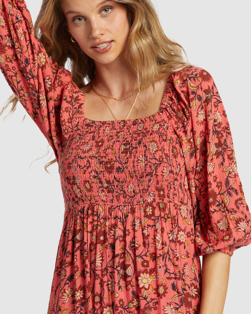 Let your style blossom in the Full Bloom Dress from Billabong's A Sunset Away collection. The viscose crinkle fabric and smocked bodice create a fitted yet comfortable look, while the 3/4 blouson sleeves and contrast ruffle at the skirt's hem add an elegant touch.